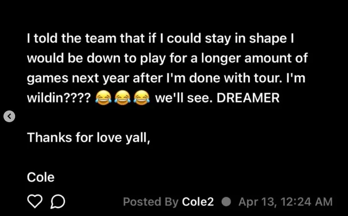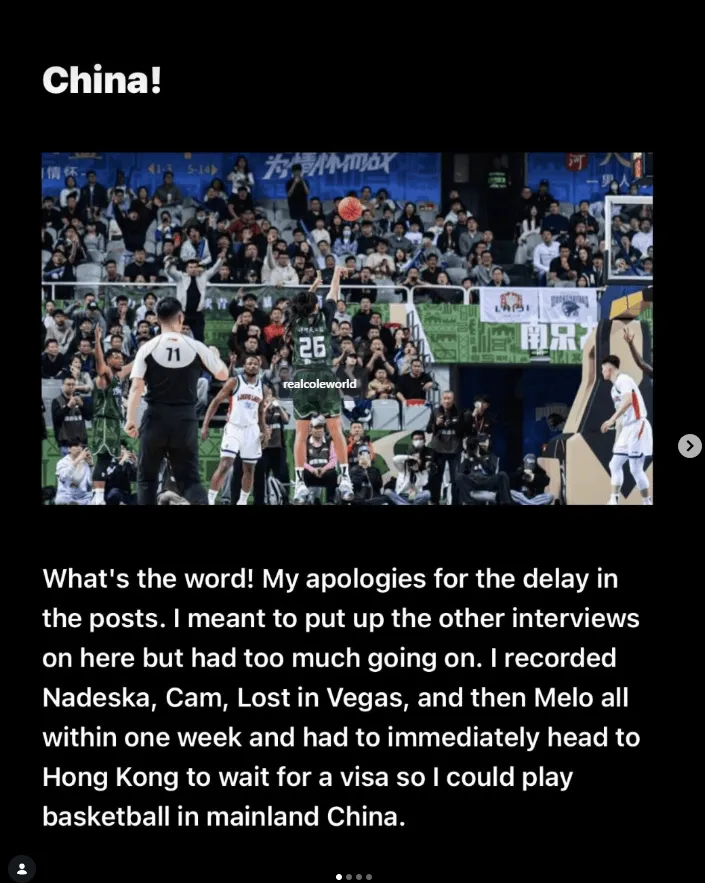 虎扑04月13日讯 今日,说唱巨星J.Cole更新个人社媒,说明因签证与工作原因无法参与后续的CBA比赛,同时对于CBA、南京队以及球迷表达了感激与抱歉。