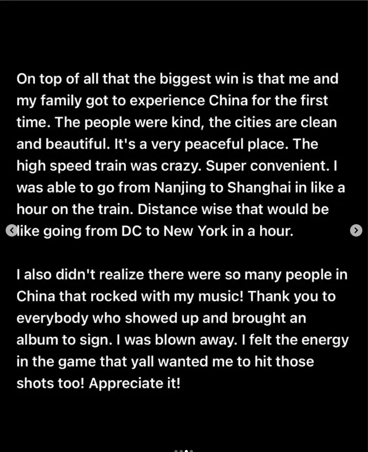 起初,我被安排参加至少三场由中国职业篮球联赛(CBA)南京队举办的比赛。然而,工作签证的办理过程比预期要长得多,因此在我启程回国前仅能参加其中一场比赛。我想向南京俱乐部以及CBA表达我的谢意,感谢它们让我得以拥有这段非凡的经历。同时也要感谢我的队友们,他们表现得非常酷,并且真心希望我能投进一个球!我得以在世界顶级联赛之一的比赛中上场8分钟,虽然有几次不错的出手机会,但未能命中。如果再打几场比赛,或许那些投篮就能逐渐变得手到擒来了!不管怎样,我已心满意足且心怀感激!天哪,我感觉好像得分达到了20分!!!而我的膝盖却感觉像是打了40分钟球一样!除此之外,最大的收获是我和我的家人首次体验了中国。这里的人们很友善,城市干净美丽。是一个非常宁静的地方。高铁简直太棒了。非常便捷。我能在火车上大概一小时内从南京到达上海。从地理距离上来说,这就像是一小时内从华盛顿特区到达纽约一样。我还未曾意识到中国竟有如此多的人对我的音乐情有独钟!感谢每一位到场并带来专辑供我签名的人。我被深深震撼了。